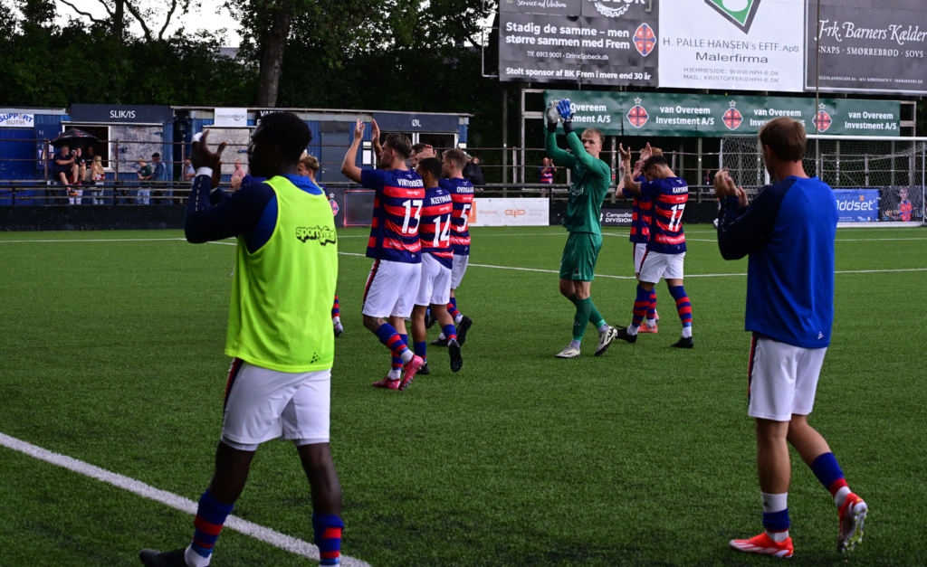 Kampen sluttede med en FREM sejr på 3-2 og hvis ambitionerne om hurtig oprykning skal indfries skal man nok undgå for mange anden halvlege som den i dag.