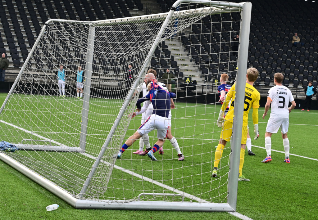 NFC-målmand Jeppe Rasmussen fejlbedømte indlægget og kom lidt på mellemhånd, og i to forsøg lykkedes det i stedet for et par af forsvarsspillerne at komme i vejen for afslutninger fra FREM-fødder.