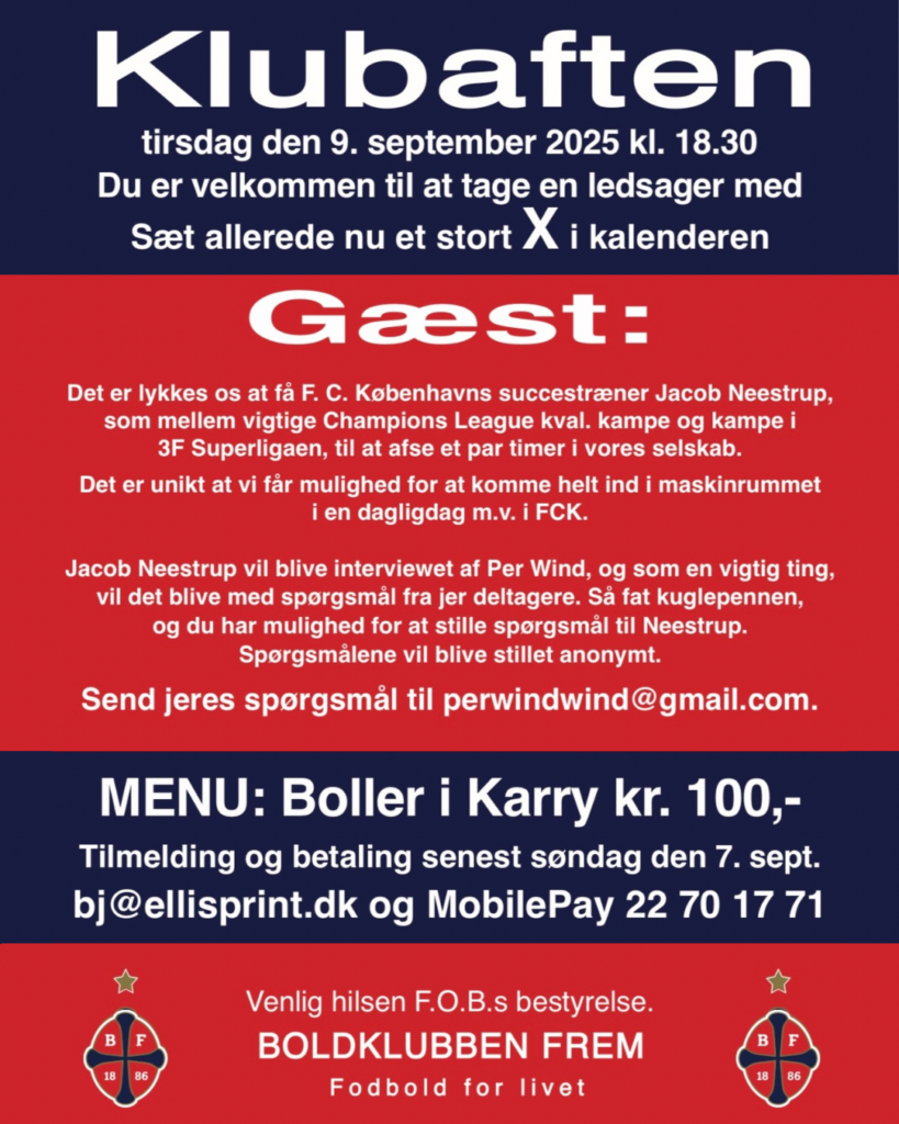 Vi nærmer os fuld tilmelding til klubaftenen den 9. september, hvor FC Københavns cheftræner Jacob Neestrup gæster os. Der er kun ganske få pladser tilbage ud af de i alt 70 – så skynd dig, hvis du vil med!